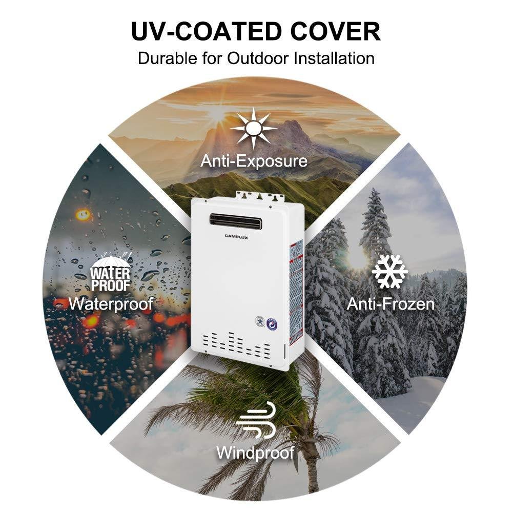 The Camplux 6.86 GPM tankless gas water heater is perfect for whole house use, supplying more than two hot water applications at the same time.Constant temperature function gives you consistent hot water with pre-set temperature.Anti-freezing protection device, which will heat automatically when the temperature lower than 40℉(5℃).Camplux water heater with innovative combustion technology and advanced multiple protection systems to ensure your safety.