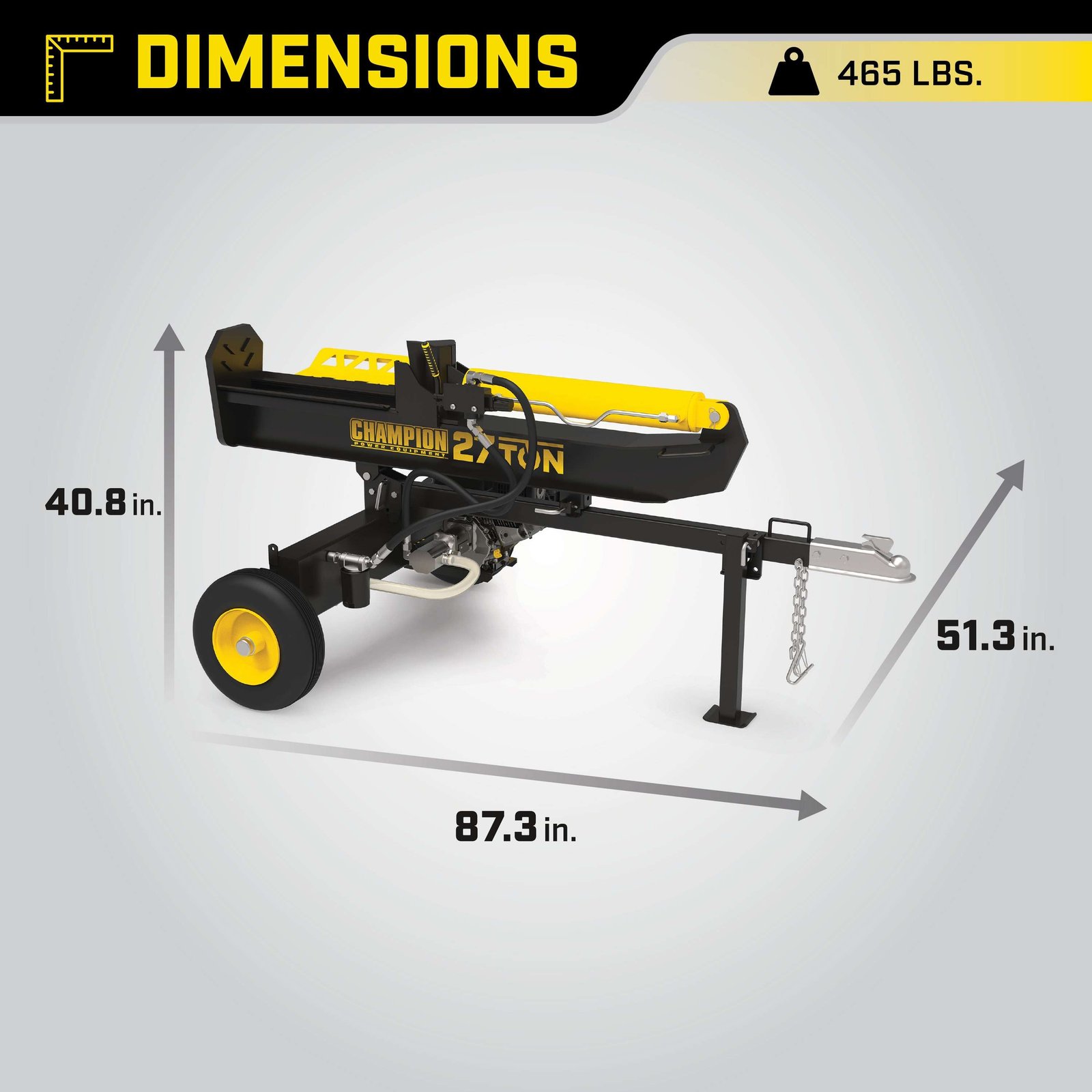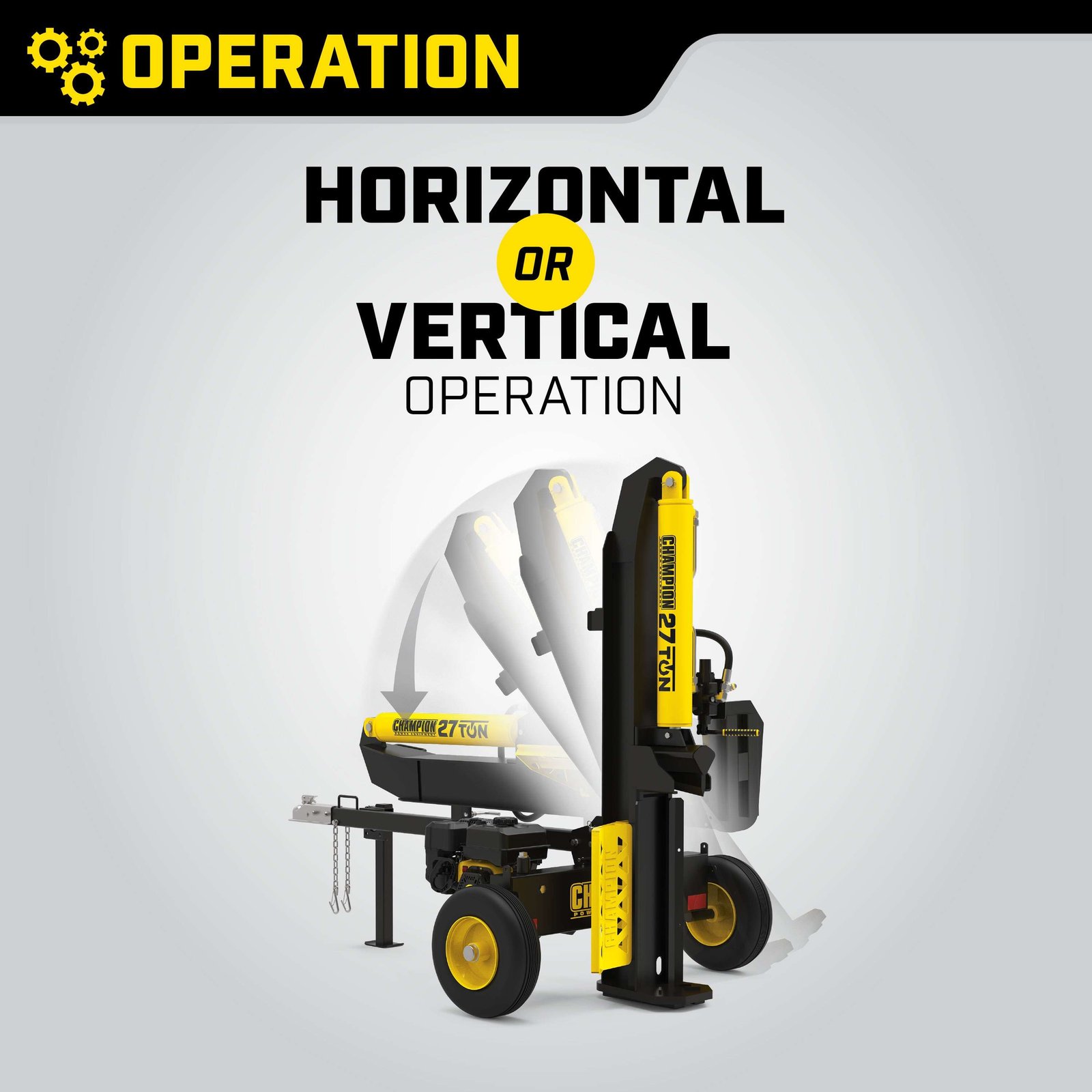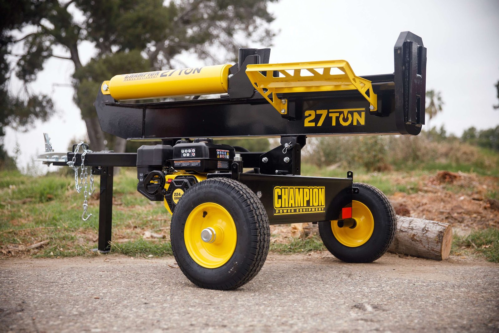 The Champion Power Equipment 201312 27-Ton Horizontal/Vertical Full Beam Log Splitter not only offers relief from the back-breaking work of splitting logs, but also reduces your work time so you can move on to other tasks. Depend on the reliable recoil start to start up the powerful Champion 224cc single-cylinder OHV engine, which features a cast-iron sleeve, a 0.82-gallon fuel tank, 0.5-quart oil capacity (recommended 10W-30) and a low-oil shutoff for safety.
