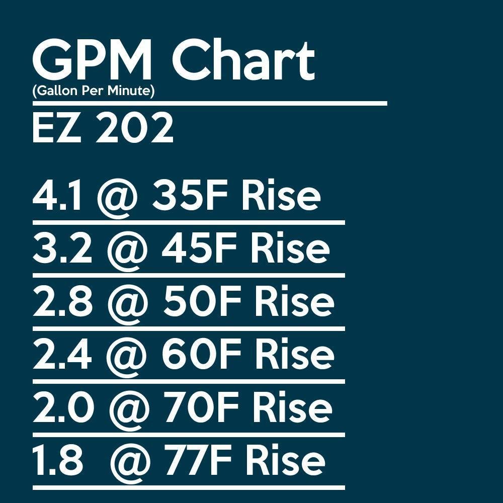 The EZ 202 delivers up to 4.0 gallons per minute of consistent and continuous hot water at a 35°F rise. With low water pressure ignition, this heater can function under 0.02 Mpa (2.9 Psi) of water pressure. No plug-in is required, making this the perfect unit for garage, barn, or outbuildings. This “No pilot light” design is safe and convenient, using automatic ignition to further your energy savings. (The ignition electrical source is supplied by two “D” cells) The EZ 202 is an excellent choice for anyone needing occasional on-demand hot water. Our LP model is ideal for use during hunting or camping expeditions, or you may choose to use this heater for semi-permanent OUTDOOR installations at long term campsites, small lake homes or cabins. Or for those who live in remote rustic cabins and homes with one bath.