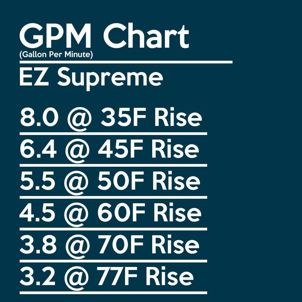 The EZ Supreme is a whole home water heater designed for households of 1-3 bathrooms, averaging between 5 -7 GPM. The EZ Supreme is also a self regulating water heater, meaning the heater automatically adjusts the burners according to the water flow to ensure the desired temperature is reached at your tap. Simply set the temperature on the screen and the heater does the rest of the work for you! For instance, the average sink tap runs about 1 gallon per minute while the average shower head runs about 1.7 – 2 gallons per minute. With this in mind, the EZ Supreme can easily handle any two hot water taps running simultaneously and in some cases three!