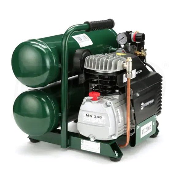 Model FC2002 features a classic stack-tank design combined with a low-amp draw, 2 HP motor for high output and consistent production. 4.1 CFM @ 90 PSI. Motor features also include manual-overload protection for longer life and ball bearings for great durability. Oversized crankcase helps hold oil viscosity longer and protects pump on unlevel surfaces.