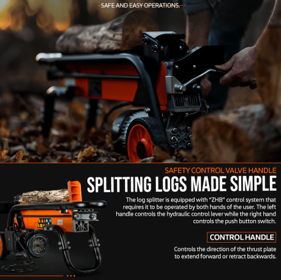 Built with a heavy-duty 1-3/4eHP 15Amp 1500W Electric Motor that is IP54 rated, powering our 6-ton rated hydraulic system with 13,500 Pounds of Pressure, that easily splits logs up to 20.5″ inches in length and up to 10″ inches in diameter; All weighing 100lbs.